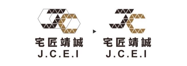 將logo加入J.C.兩個英文字母,以正三角形拼接的方式結合六角形概念,意象鋼骨架構的穩固性,象徵著公司的謹慎與專業。在字母中加入切割結構的元素,有如一塊一塊的磁磚拼貼,意旨一個一個的工程 環環相扣,公司都能夠完整的處理每個流程。另外以金色系為主,增加防水的概念。